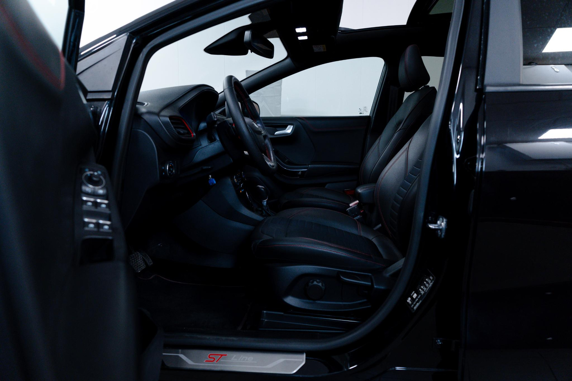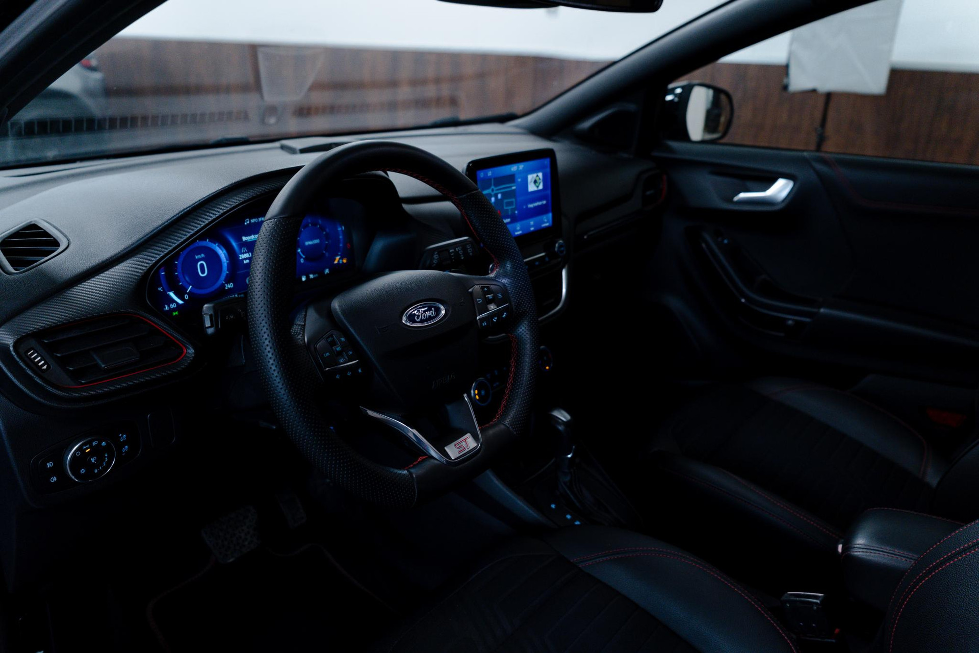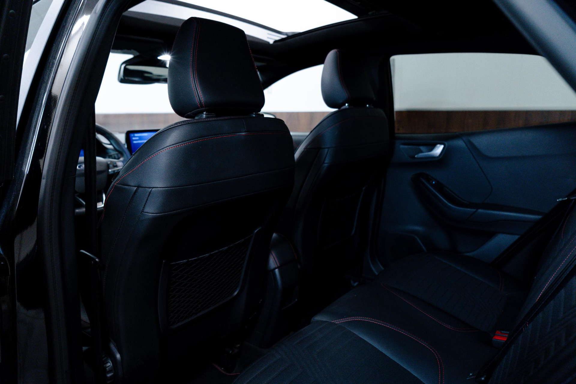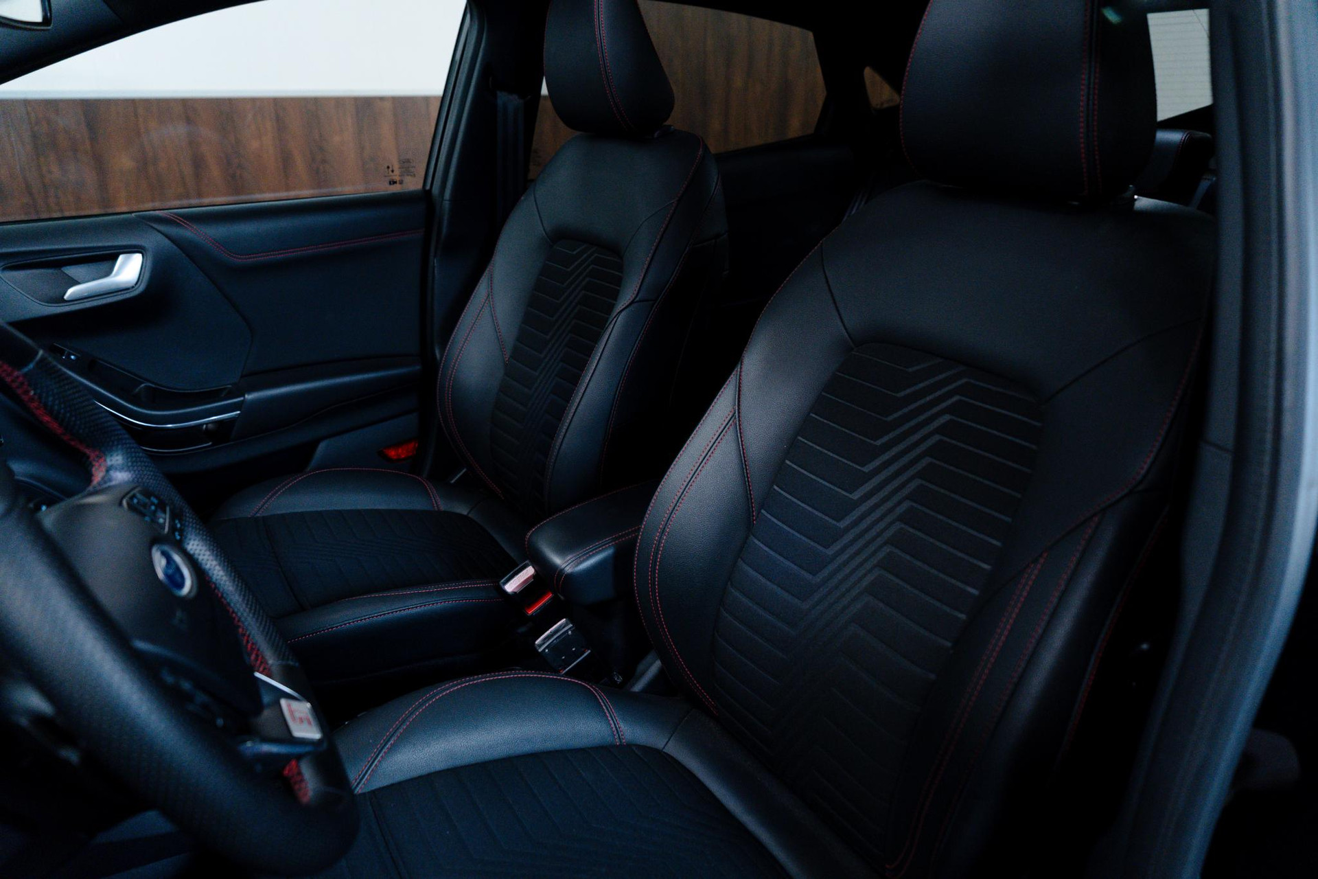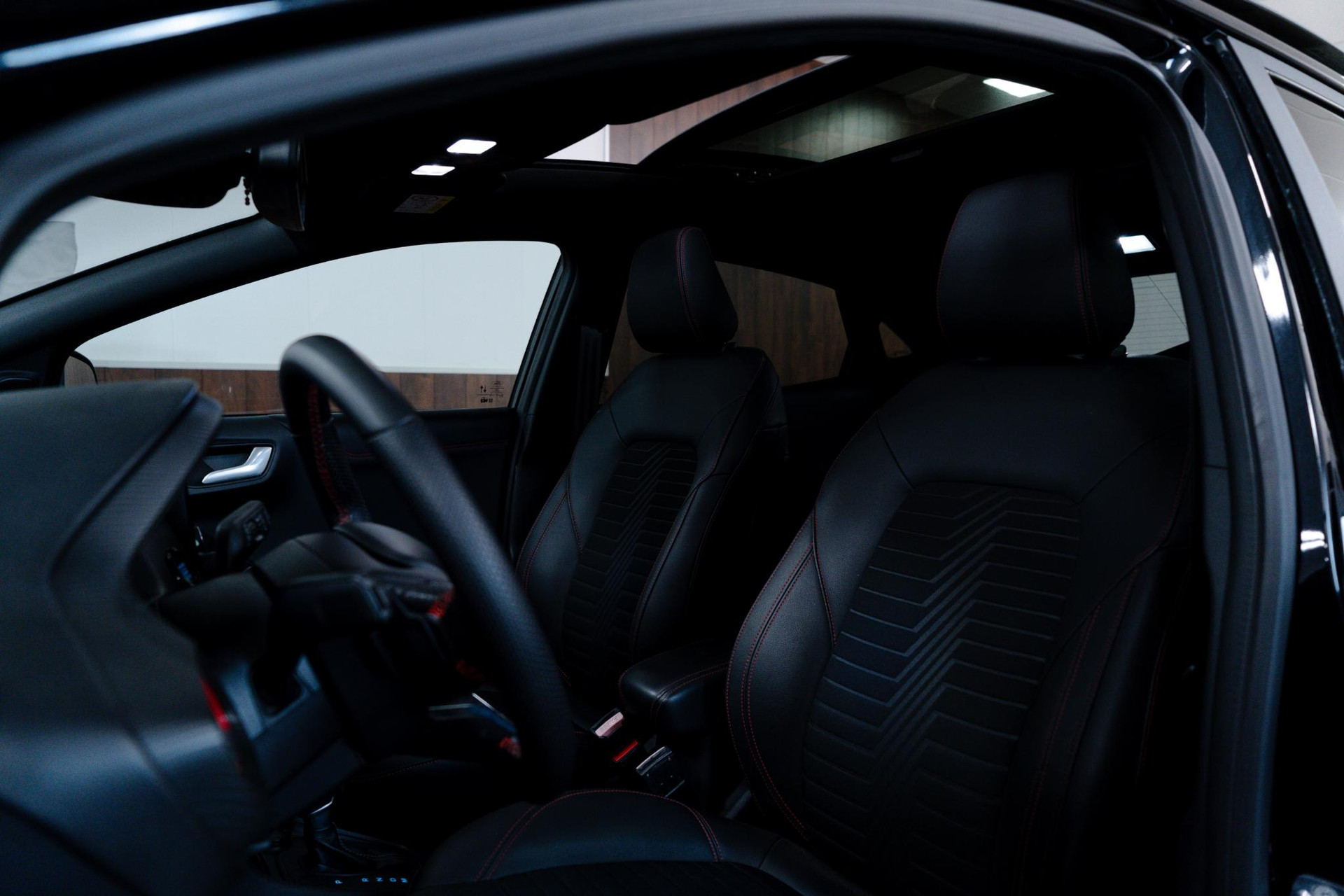 - Lederen stuurwiel met rode stiksels en schakelpeddels (elektrisch verwarmbaar)